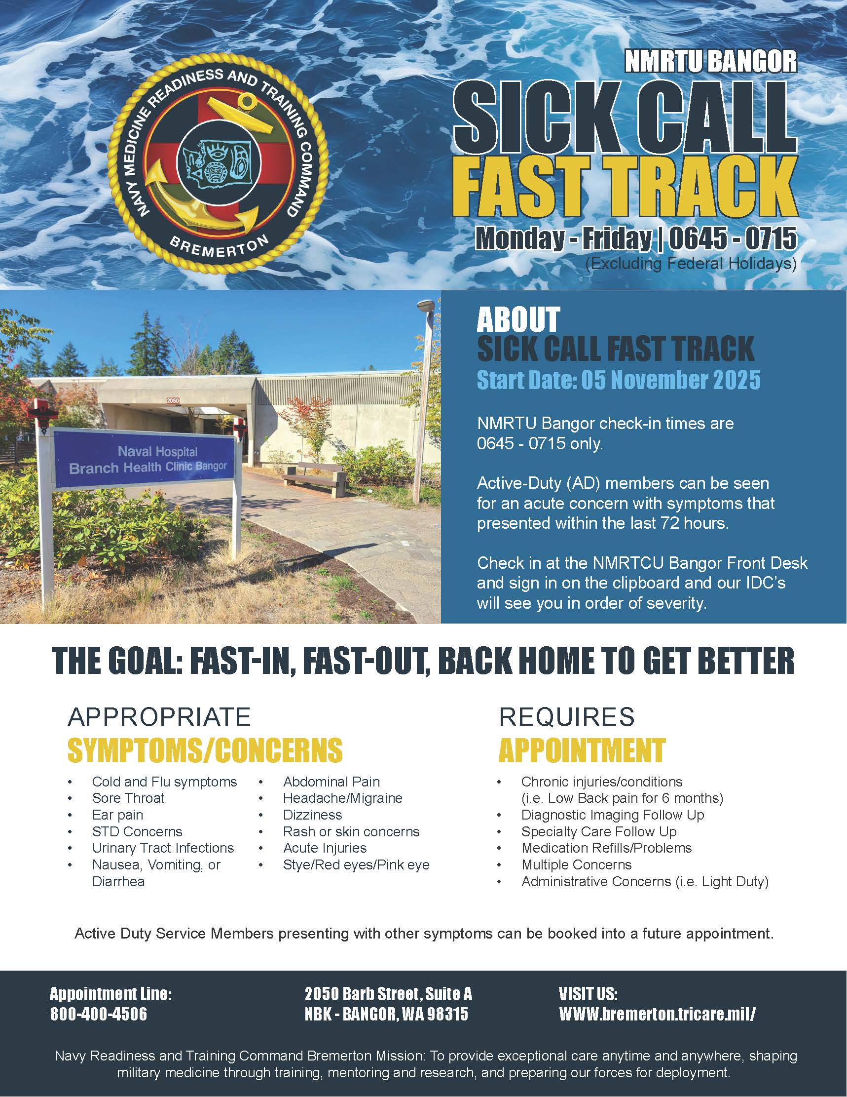 Occupational Medicine is available to Naval Base Kitsap, Naval Base Bangor, Naval Undersea Warfare Center Keypor